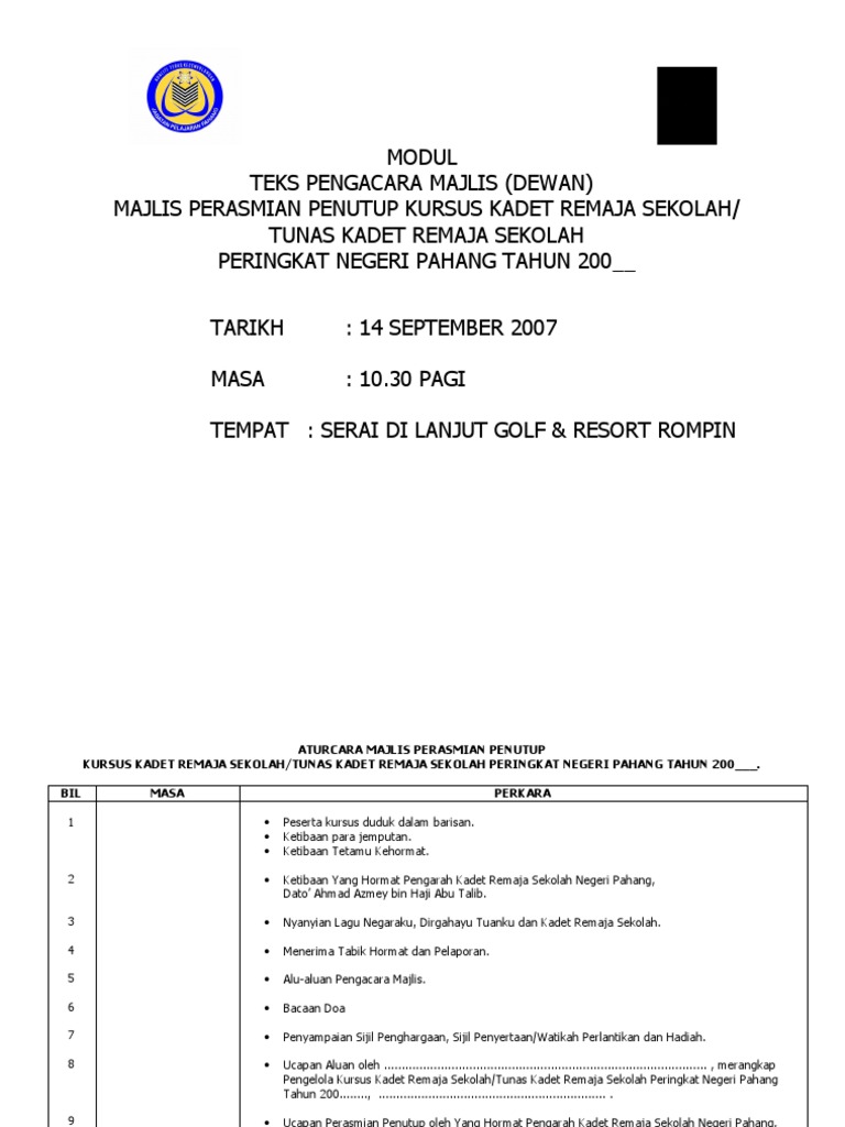 Masuk ke perkarangan majlis, para hadirin diminta untuk berdiri. Yang berbahagia, encik yew kok leh, pengetua smk jalan mengkibol. Melalui program ini, murid akan dibimbing melalui fasa alam tadika kepada alam persekolahan secara formal. Ibrahim ydp pibg untuk menyampaikan ucapannya. Indah berbalam si awan petang, berarak di celah pepohon ara; Juga sesuai diubahsuai untuk program sambutan lain dan juga peringkat daerah serta kebangsaan. Majlis_ymk_2012_teks pengacara.doc skrip majlis penutupan kursus pembangunan individu dan organisasi teks pengacara majlis untuk program satellite sains center.doc Contoh teks pengacara majlis majlis perkahwinan adha & azwan. Text of teks pengacara kursus kepimpinan. Contoh teks terbaik dan lengkap dari mula program sehingga akhir penutup. Contoh teks mc kursus cpd. Kursus kepimpinan pengurusan kelab dan persatuan. Majlis seterusnya ingin menjemput dan mempersilakan kepada yang dihormati tuan haji mohd nor b.